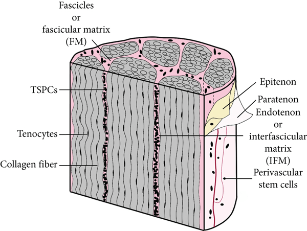 Tendons are composed of bundles of collagen fibers called fascicles, and a water-based gelatinous structure called the interfascicular matrix.