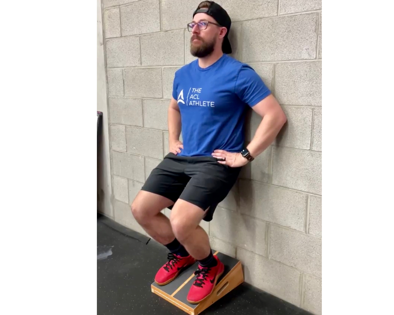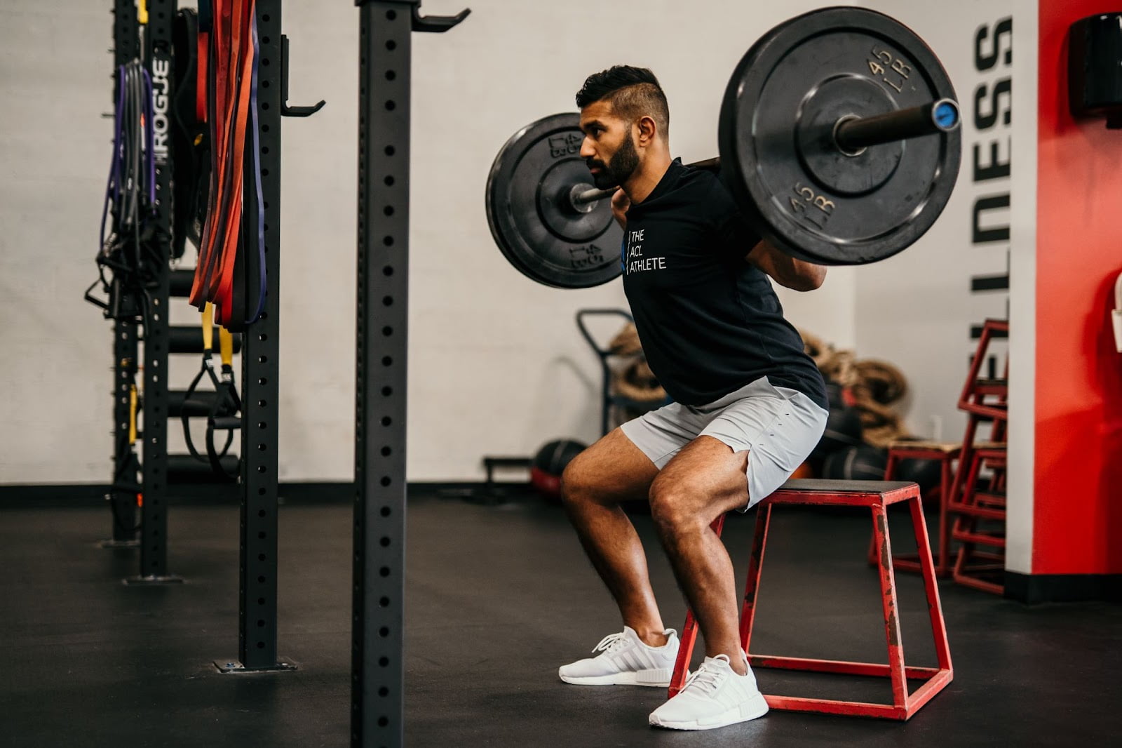 Squat variations like this tempo box squat can be utilized to encourage adequate loading. In this instance the shortened depth and forward knee/upright trunk positioning is biased for patellar tendon loading.